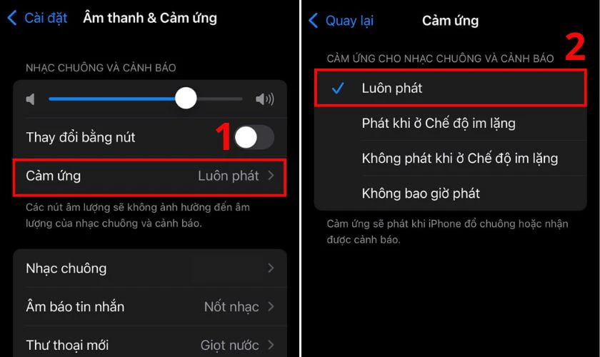 Vào phần Cảm ứng (Haptics) → chọn “Luôn phát” (Always Play)