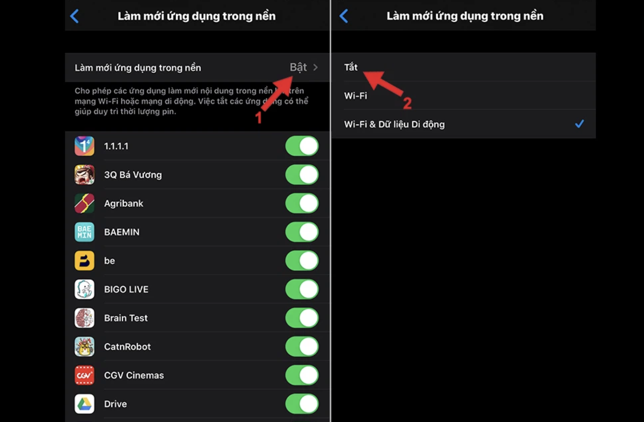 Bước 2: Chọn Làm mới ứng dụng trong nền => Tắt để dừng các ứng dụng đang chạy ngầm.