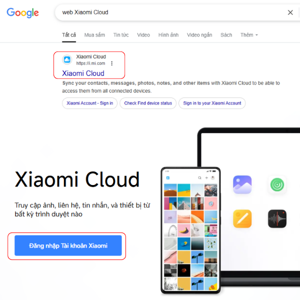 - Bạn vào Google và tìm kiếm web Xiaomi Cloud, chọn đăng nhập bằng tài khoản Mi.